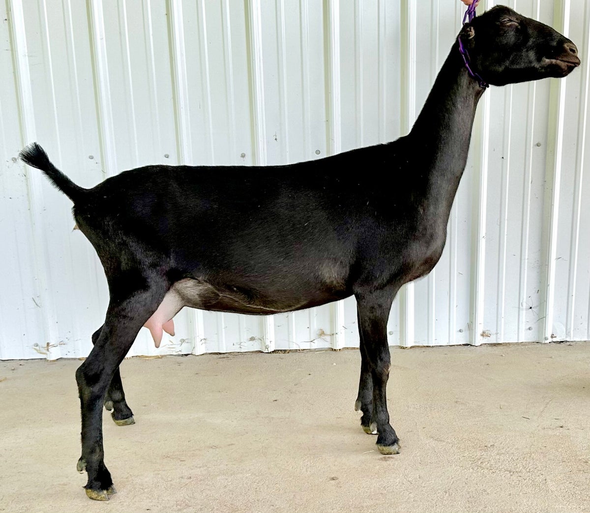 Roisin Dubh (row-sheen-dove), meaning little black rose, is a perfectly suited name for this dark imp of a goat. She shares Naoise's fantastic shoulders and we love her improvement in foreudder over her dam. She also shows pleasant levelness of rump, udder texture, and fantastic milk down. We would like to see more evenly sized teats and depth of body at this time. She is immature and on the smaller side but she is maturing beautifully.