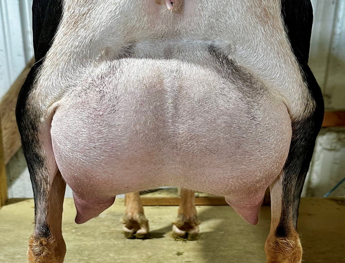 Holly, our mischievous "pocket" goat, is very personable and always looks for something to open or get into. She has a beautiful head that emphasizes her elfishness. Although Holly is a smaller doe who did not fully mature into the glamour her famous family is known for, she is wide and broad-chested with a long, wide rump and loads of dairy strength. Her mammary is her best feature, with a snug fore udder, butter-soft udder texture, and production. We would like to see a more smoothly blended neck and a more level rump slope. Holly met the ADGA points requirements to earn her milking star in her 2021 lactation.